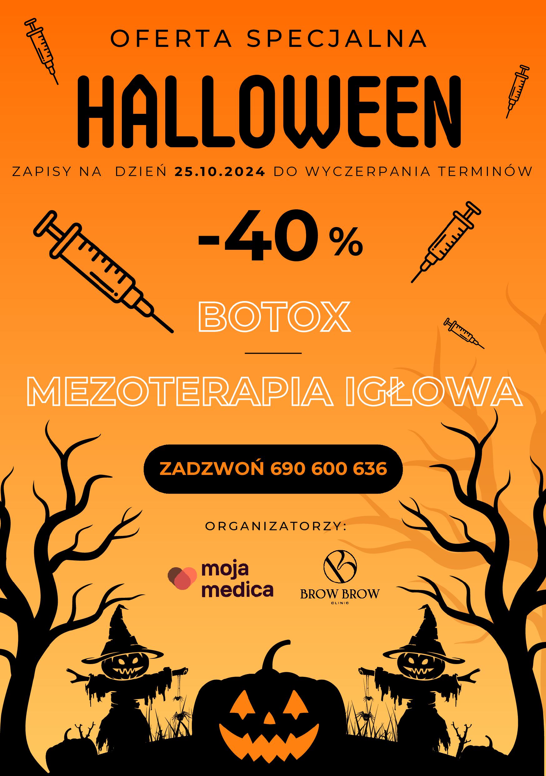 25.10.2024 szykujemy dla PAŃSTWA STRASZNIE WIELKĄ PROMOCJĘ!!! Tylko w tym dniu będziecie mogli wykonać botoks oraz mezoterapię igłową oka w szalonej promocji -40%. Organizatorami wydarzenia jest Klinika MojaMedica & BrowBrow Clinic. Czekamy na Was z licznymi niespodziankami 🙂
